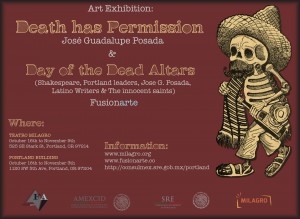 Las entidades culturales ‘Fusionarte’ y ‘Milagro’, con el apoyo del Consulado de México en Portland, tendrán el agrado de presentar simultáneamente la exhibición ‘La Muerte tiene Permiso: José Guadalupe Posada’ en las instalaciones del Teatro Milagro y del edificio Portland Building, ambos localizados en esta ciudad.