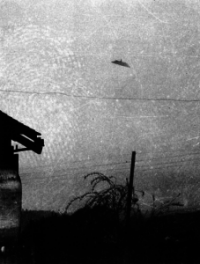 While flying his CallAir Model A on a business trip, and taking a diversion as a volunteer effort to help find a recently crashed military transport, Kenneth Arnold suddenly spotted a flash of light in the sky. Thinking it was a sun reflection from another airplane, Arnold looked around and sighted nine apparently metallic craft winding their way across the mountains. Intrigued, he was able to time their progress and, by estimating their relative size, he calculated their speed to be greater than any known aircraft at that time. He said their flightpath resembled that of the tail of a Chinese kite, with the craft bobbing up and down while flying in a line. He described the motion as 'as if a saucer were skipped across water', which a news reporter later erroneously attributed to the crafts' shape, despite Arnold reporting them as shaped like a crescent. Soon everyone was sighting saucer-shaped objects for at least two decades.