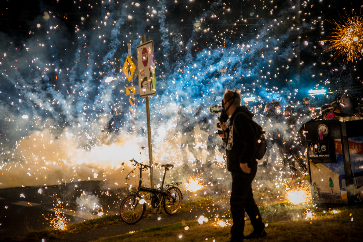 Portland became one of the main flashpoints of resistance during the BLM protests last summer which involved intense confrontations and police attacks. According to the DOJ, police arrested 1000 people, and used force over 6000 times. For over 100 consecutive nights, police pounded BLM protestors with tear gas, pepper spray, stun grenades, rubber bullets and impact munitions. Many people suffered injuries, and lawsuits were filed against the excessive use of tear gas and police violence. This protest on Sept. 5, 2020 to mark 100 nights of resistance in Portland was no different. The police set up a road block on Stark and 113th Street, declaring the march an “unlawful assembly.” About 400 protestors refused to comply with the police order to disperse, setting off fireworks and 3 Molotov cocktails, which set a man’s pants on fire. Several protestors rushed to put out the fire, preventing any serious injury. The police declared a riot, and wasted no time in charging at the protestors, firing rounds of tear gas and stun grenades. About 59 protestors were arrested.