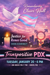 Transpositive PDX is a biweekly program dedicated to amplifying transgender, non-binary, and gender non-conforming voices. We focus on activism, arts, culture, and dialogue happening in Portland and beyond. Whether it’s through honoring the lives of trailblazers like Claire Hall or addressing urgent social issues like the murder of Renee Good, our goal is to provide a space for affirmation, reflection, and connection.