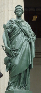 Image: "Lady Justice is not happy" by Dave Lonsdale licensed under CC BY 2.0. Cropped. Shows a statue of Justice open-eyed with the scales tucked under one arm.